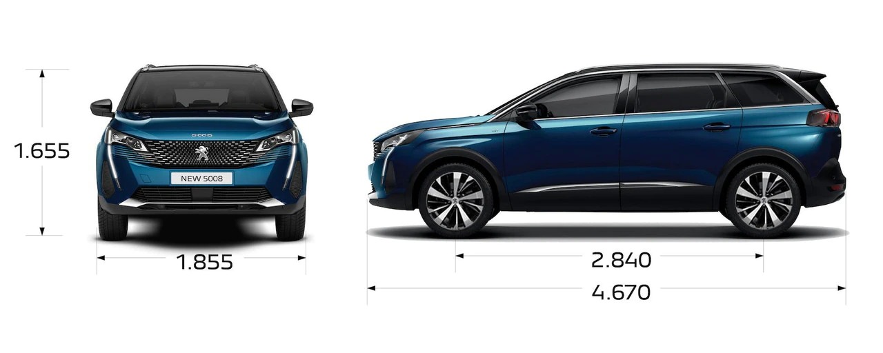 Xe có chiều dài tổng thể lớn (4,670 mm), điểm xuyết từ thân đến hông xe là các thanh chrome kéo dài, tạo nên ngoại hình xe sang trọng, đậm chất Châu Âu. Phiên bản 5008 GT dùng mâm 19 inch thiết kế phong cách New York.